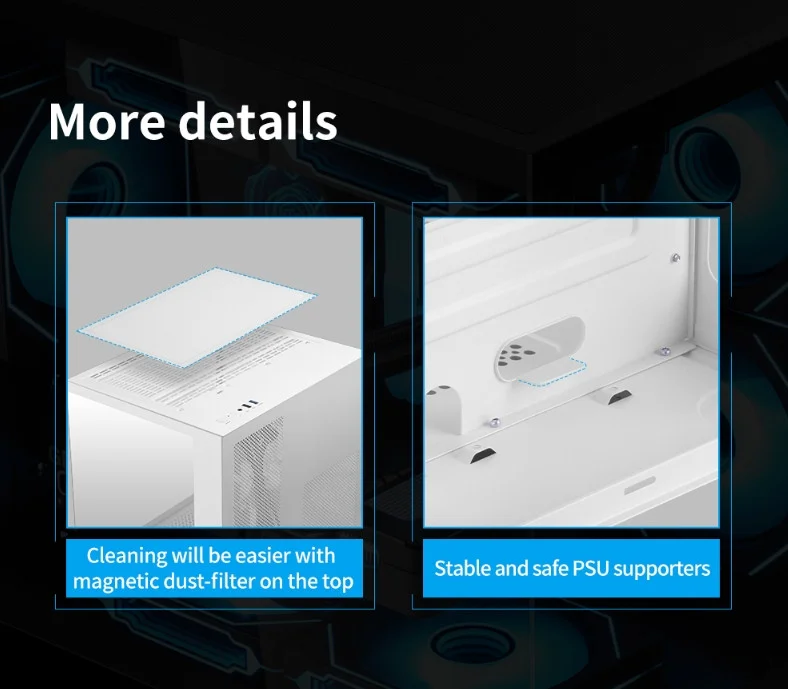 Manyetik toz filtesi ile daha kolay şekilde temizlik yapabilirsiniz.Kararlı ve güvenli PSU destek ayakları.